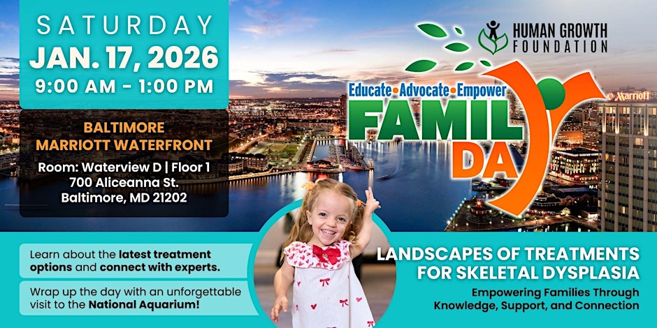 Join the Human Growth Foundation (HGF) for a FREE Skeletal Dysplasia Family Day—an inspiring morning of expert insights, community connection, and support, plus a special National Aquarium experience for registered attendees! Don't miss this opportunity to learn, connect, and create lasting memories. We can't wait to see you there!