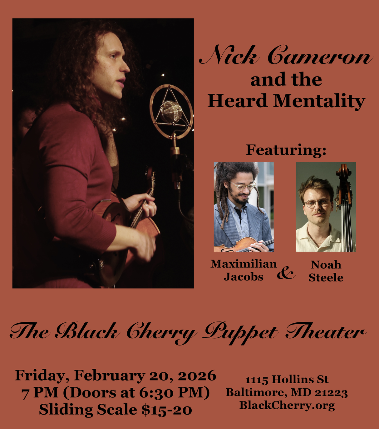 Nick Cameron and the Heard Mentality, featuring Maximilian Jacobs (violin) and Noah Steele (upright bass), is led by vocalist, mandolinist, and composer, Nick Cameron.