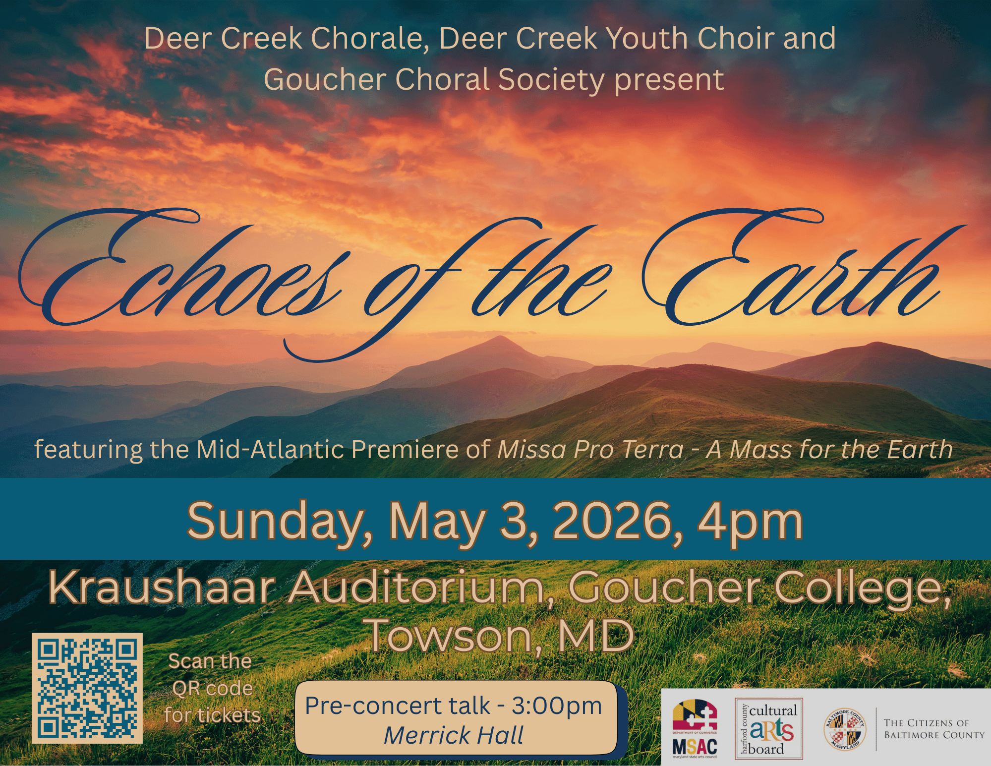 Join us for a collaborative concert featuring Deer Creek Chorale, Deer Creek Youth Choir, Goucher Choral Society and guest orchestra featuring the Mid-Atlantic premiere of Missa Pro Terra: A Mass for the Earth by Canadian composer Paul A. Aitken. Dr. Paul Rardin will serve as guest conductor. Pre-concert talk at 3:00pm in Merrick Hall.