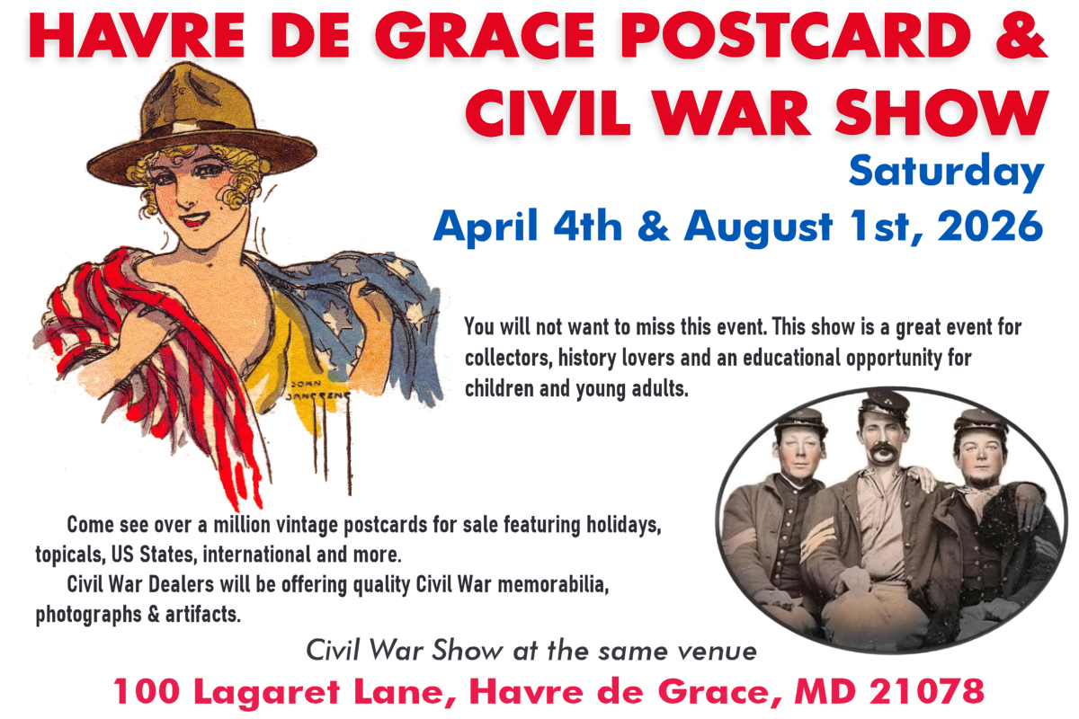 Join us on Saturday, April 4th, from 9 am to 4 pm, for a captivating journey through history at the Havre de Grace Postcard & Civil War Show. This show is a great event for collectors, history lovers and an educational opportunity for children and young adults.