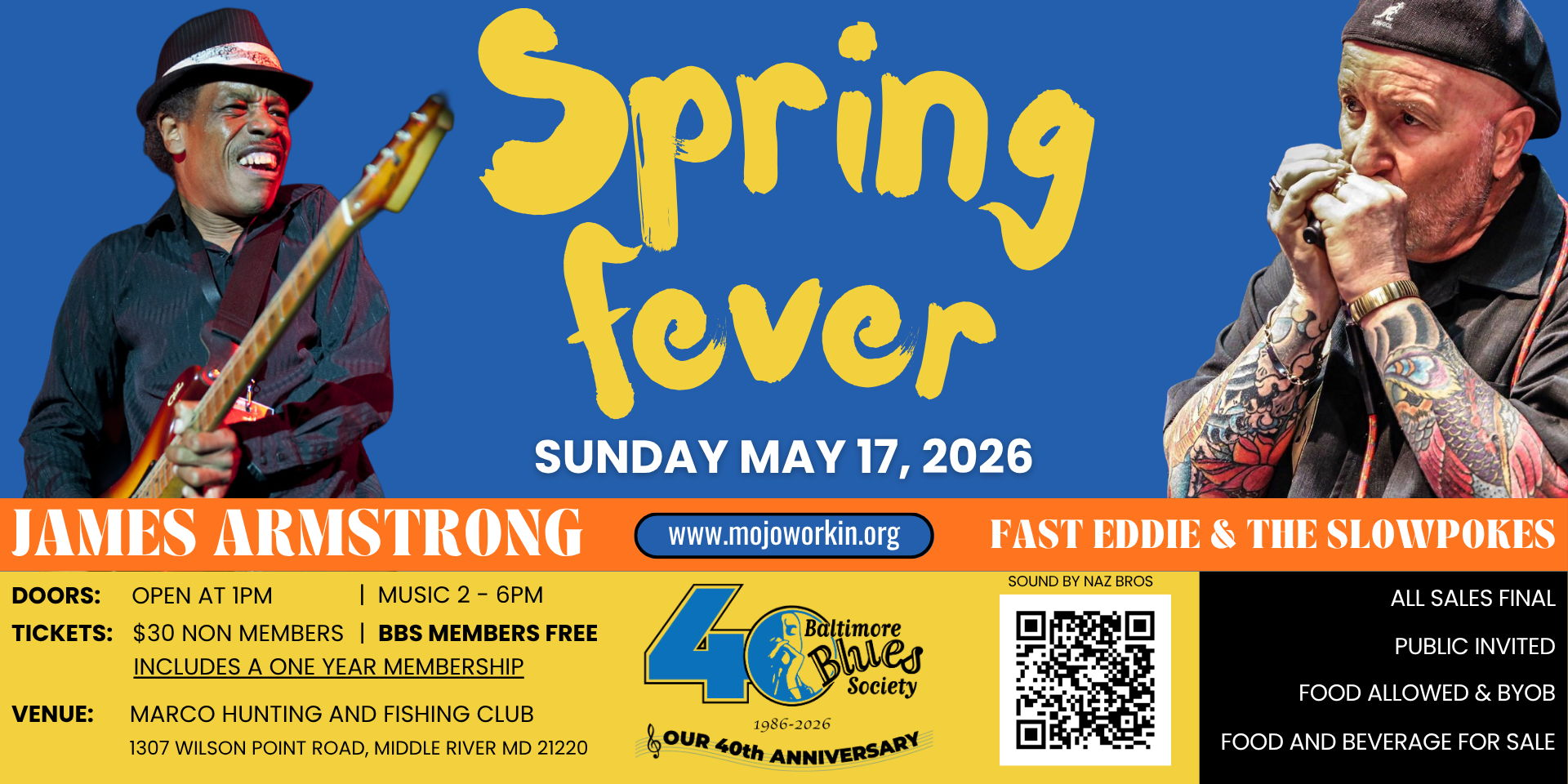 JAMES ARMSTRONG Born into a musical family in 1957 in Los Angeles, James Armstrong had blues music in his blood from the very start. His Mom was a blues singer, his Dad played jazz guitar. Armstrong formed his first band in the 7th grade, and by age 17 he was touring the country. James would start making waves on the local California blues circuit by his 20s, becoming the youngest member of Smokey Wilson's band. In the 1980s, James was a founding member of the band Mama Roo and received his first recording contract for Crescendo Records. In the early 90s, James got plenty of exposure from his musical influences, including Albert Collins, and Sam Taylor. Shortly after that, he was discovered and signed by HighTone Records owner Bruce Bromberg, who had discovered and signed Robert Cray and Joe Louis Walker. Over the years, Armstrong has performed in many countries throughout North America, Europe, Scandinavia, Asia and the Middle East. Armstrong has shared the stage with many artists like 'Keb Mo', Coco Montoya, ChakaKahn, Tommy Castro, Shemekia Copeland, Tab Benoit, Charlie Musselwhite, Walter Trout, Doug MacLeod, Roy Brown, Ricky Lee Jones, Jan and Dean, Mitch Mitchell, and many more. James was also noticed by the music industry, having songs in three major motion pictures. "Bank of Love" was used in Hear No Evil, with Martin Sheen and Marlee Matlin. "Two Sides to Every Story" was featured in Speechless with Michael Keaton and Geena Davis, and also in The Florentine with Jeremy Davies and Luke Perry. Armstrong continues to tour extensively. He pays tribute to the past withthe traditional blues, and his unique songwriting skills. Using both slide and pick, James' guitar playing is some of the smoothest in the business. James regularly brings his vibrant and welcoming live shows to people around the globe. FAST EDDIE & THE SLOWPOKES Fast Eddie & The Slowpokes are guaranteed to get you up on your feet! TheSlowpokes playlist is inspired by classic blues material from Chicago to West Coast Swing, Motown to Muscle Shoals, and all the rock n' roll in-between. Fast Eddie & The Slowpokes have performed from Philly to Memphis, from The Kennedy Center to festivals to roadhouses. They have shared the stage with Mark Hummel, Victor Wainwright (2016 BMA Entertainer of the Year), The Nighthawks, Junior Watson, Big Joe & The Dynaflows, TheAndy T Band, Jimmy Thackery, and Phil Pemberton of Roomful of Blues. They won the 2016 and 2012 DC Blues Society Battle of the Bands and represented the DC Blues Society at the 2017 and 2013 The International Blues Challenge in Memphis! In 2017, they were Semi-Finalists at the International Blues Challenge! In 2024, they were finalists for Best BluesBand by the Maryland Music Awards.