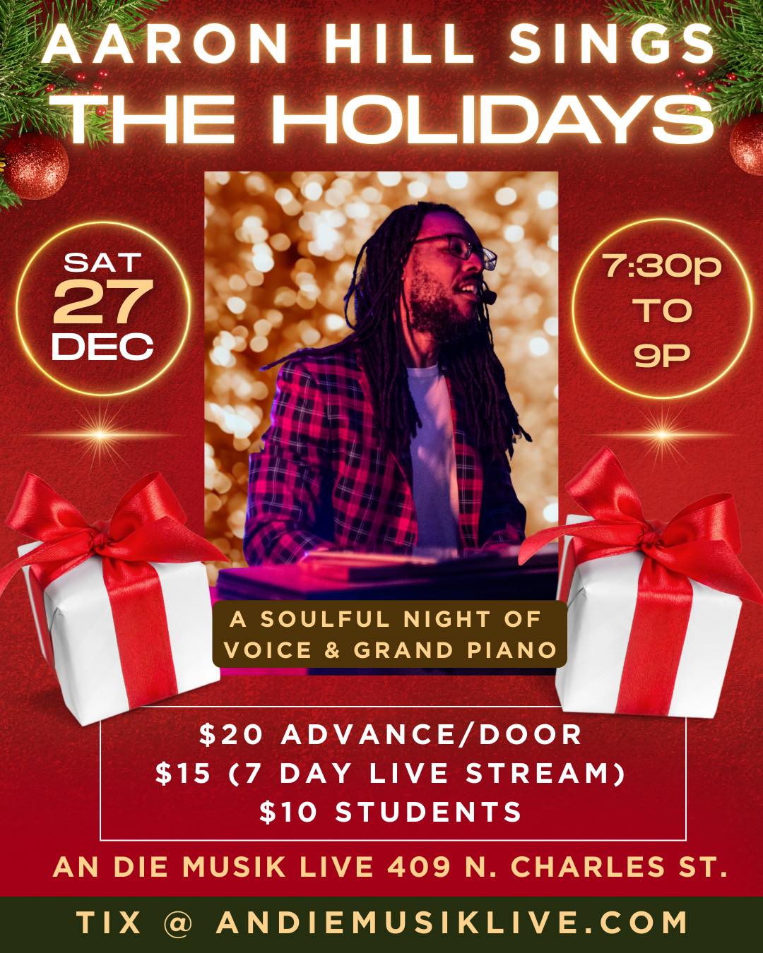Experience the warmth and magic of the season with this special solo piano and vocal concert. Known for his expressive musicianship and creative artistry, Aaron steps into a new dimension — bringing his soulful voice to the forefront for the first time in this intimate setting. Performing holiday favorites, originals and more with jazz harmony, soulful phrasing, and grand piano elegance, this concert invites audiences into a powerful and personal musical experience. Celebrate the holidays with a night of beauty, emotion, and timeless songs in the heart of Baltimore.