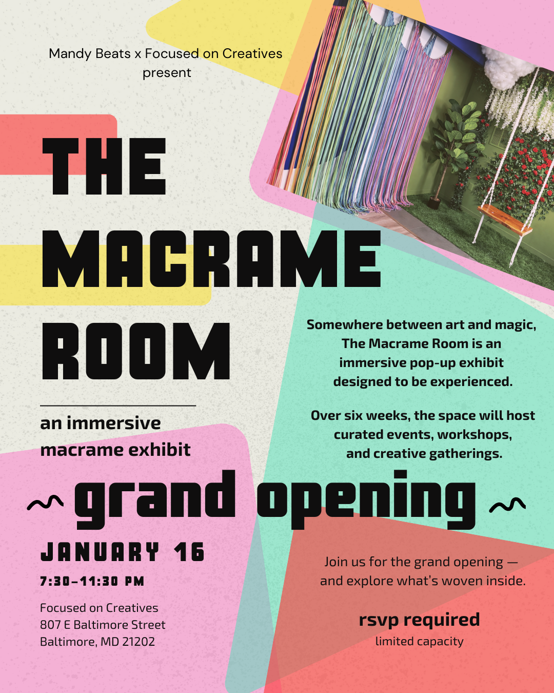 Over six weeks, the space transforms into a living installation of handcrafted macramé, texture, movement, and intentional design. Guests are invited to slow down, explore the environment, and connect through curated events, workshops, and creative gatherings.